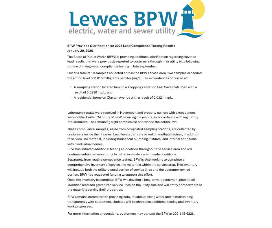 By submitting this form, you are consenting to receive marketing emails from: Lewes Board of Public Works, 107 Franklin Ave, Lewes, DE, 19958, US, http://lewesbpw.delaware.gov. You can revoke your consent to receive emails at any time by using the SafeUnsubscribe® link, found at the bottom of every email. Emails are serviced by Constant Contact.